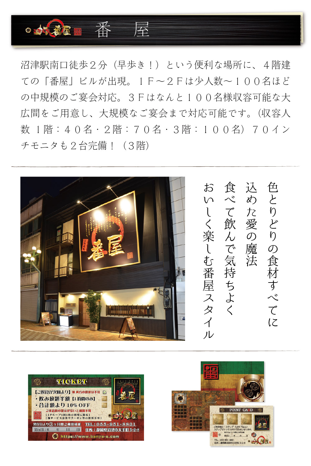 番屋からのお知らせ 最近の投稿 2025年8月18日お知らせnews 歓送迎会・80名のバブリーな宴会をどうぞ!3階お座敷は宴会貸切り可能!3階では平日の貸切り宴会もできます。 平日でのご利用人数は基本20名以上、税込5,500円から可能となります。 詳しくはコチラ! 2025年8月18日お知らせnews 各種ご予約、歓送迎会等のご予約もお待ちしております。各種のご予約お待ちしております。ページ下の【ぐるなび】からもリンクしてご予約は可能です。 ぐるなびネット予約では、後日確認のぐるなびメッセージをさせていただきます。 ご来店、ご予約お待ちしております。 2025年8月18日おすすめメニューnews 割引特典の特割プランで500円引きの飲み放題も2時間が3時間に!お得な特割プランをご利用ください。 詳しくはコチラ! 駅から歩いて2分!オリジナリィティー溢れる料理と 豊富な種類のお酒をご用意してお待ちしております